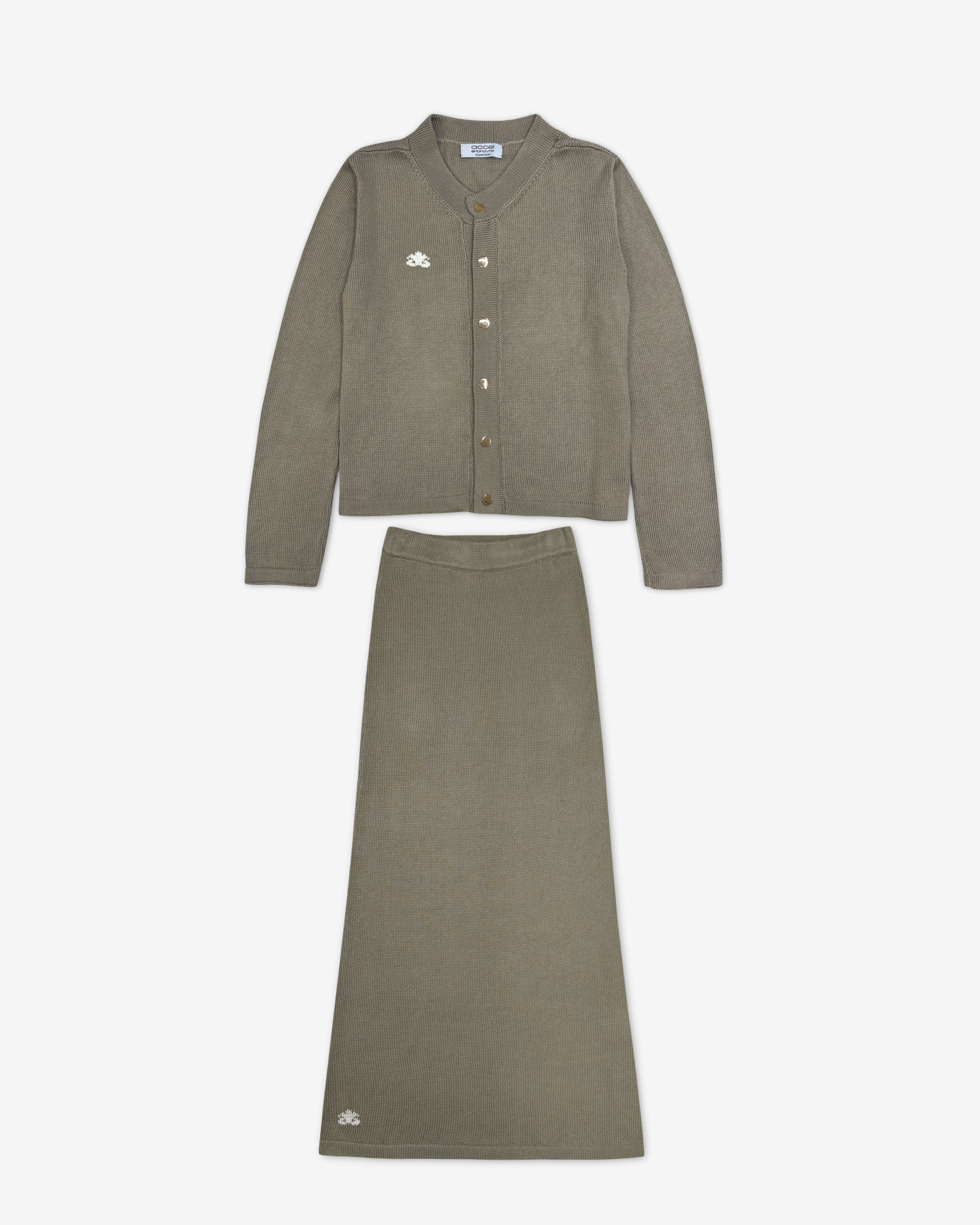 Юбка силуэта трапеция формирует женственный и гармоничный силуэт, красиво раскрываясь в движении. Кардиган классического кроя с втачным рукавом подчёркивает аккуратную линию плеч, а яркие акцентные пуговицы добавляют образу выразительность и индивидуальность.