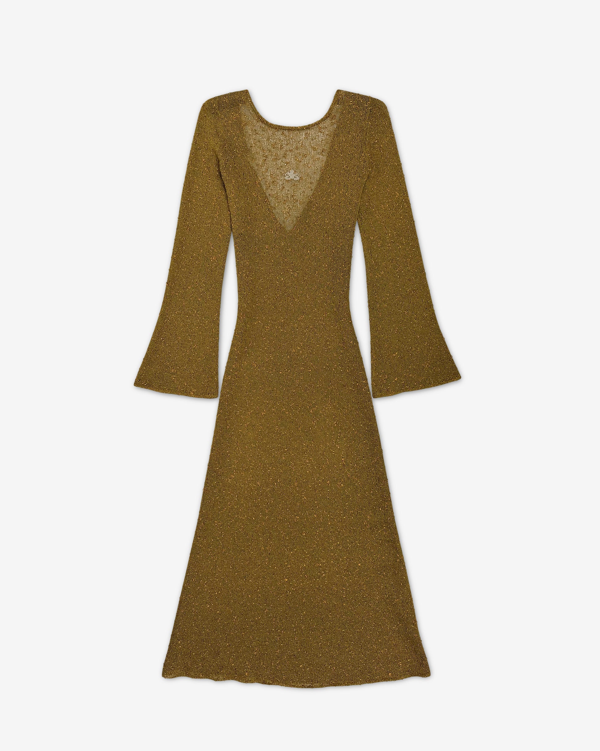 Связано вручную из вискозы с фантазийными узелками из люрекса — они деликатно улавливают свет и придают ткани лёгкое, благородное сияние. Облегающий крой подчёркивает линии тела, сохраняя воздушность и свободу движений.