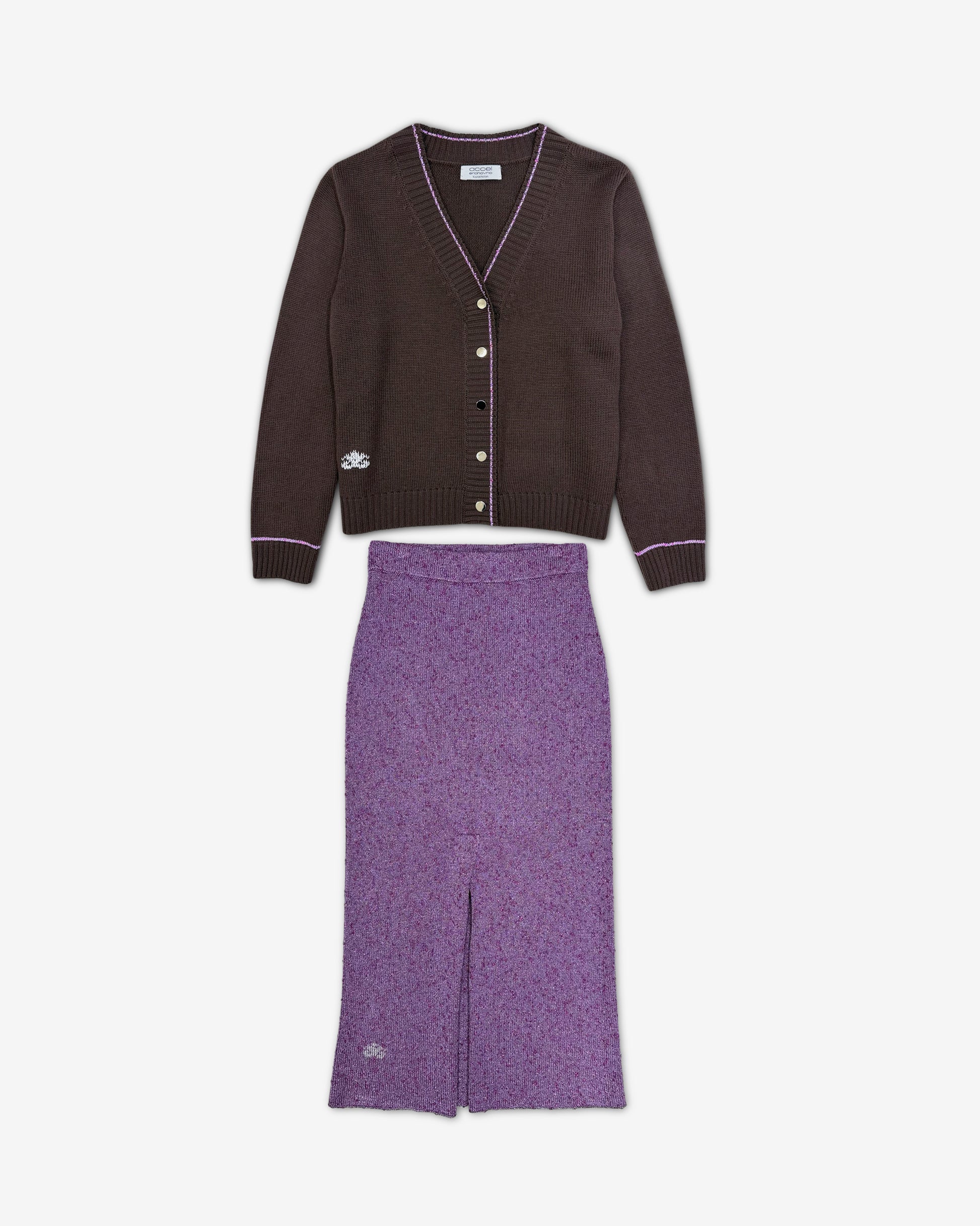 Кардиган классического кроя с втачным рукавом и V-образным вырезом выполнен из 100% мериносовой шерсти — мягкой, гипоаллергенной и приятной к телу. Детали на планке выполнены из той же пряжи, что и юбка, создавая визуальную связь между элементами костюма и подчёркивая его продуманную эстетику.
